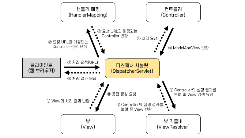 요청을 받은 DispatcherServlet은 해당 요청 URL을 처리할 Controller를 결정하기 위해 HandlerMapping에 요청을 전달합니다. HandlerMapping은 요청 URL에 대응하는 Controller를 찾아 반환합니다.