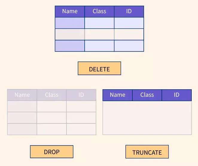 DELETE는 테이블에서 특정 레코드(행)들을 삭제합니다. 이때, 테이블의 구조나 스키마는 그대로 유지됩니다. 또한 트랜잭션을 사용할 경우 롤백을 통해 삭제 작업을 취소할 수 있습니다.